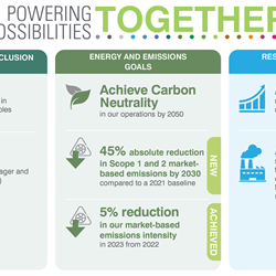 Surpassed 2023 goal to reduce annual GHG emissions intensity relative to revenue by 5% and set new goal to reduce absolute Scope 1 and 2 market-based emissions 45% by 2030 from a 2021 baseline.