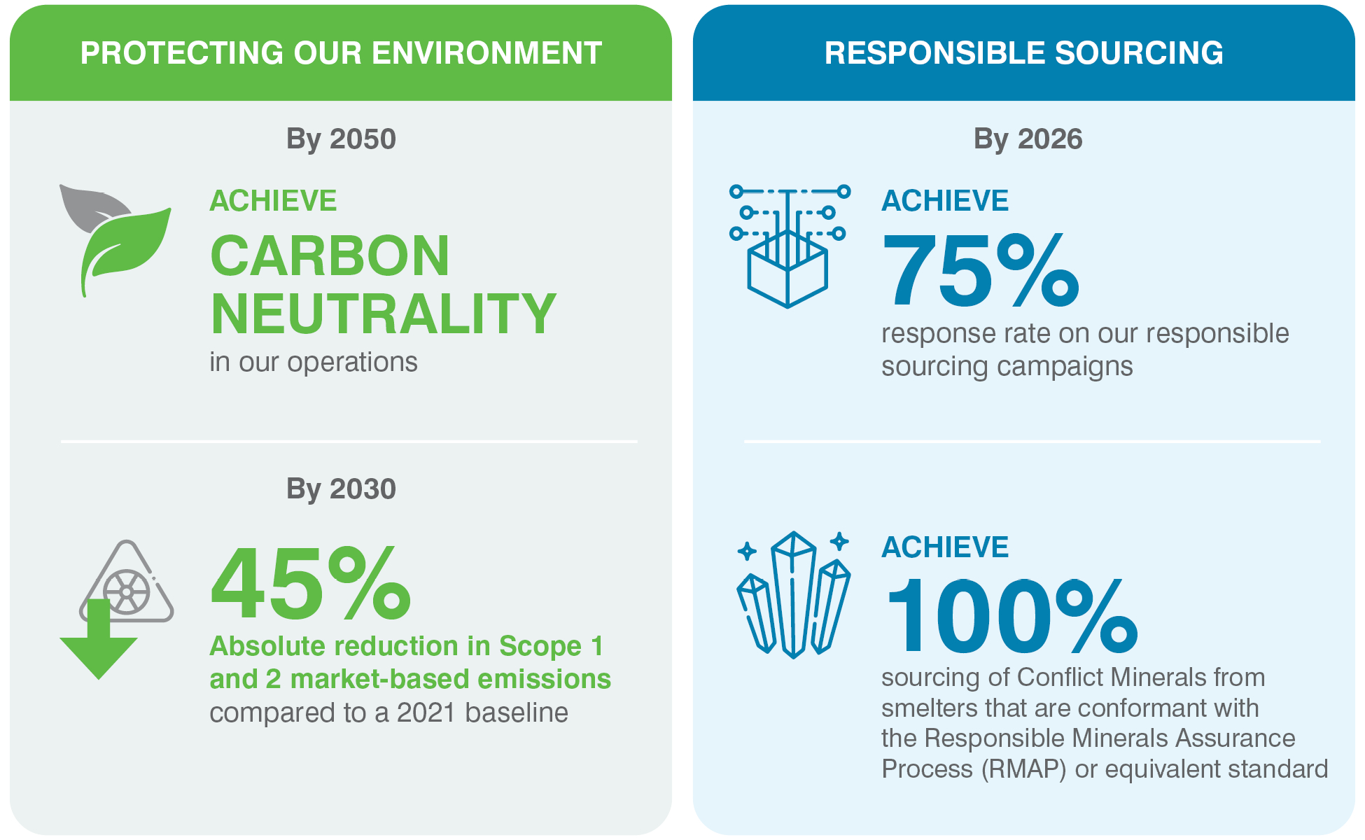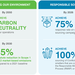Surpassed 2026 Responsible Sourcing goal for conflict minerals and extended minerals.